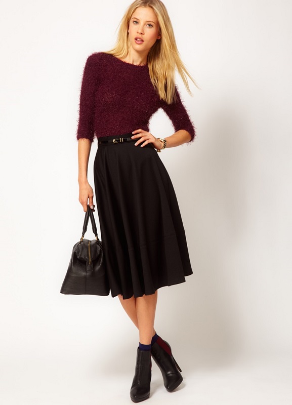 В зависимости от цвета и фактуры ткани, каждая модель отличается особым стилем и внешним исполнением. Если вы хотите создать строгий офисный стиль, используйте образцы сдержанных тонов с минимальной пышностью. Для работы подойдет черная расклешенная юбка миди, играющая двойную роль. С одной стороны, благодаря фасону образец вносит легкость и женственность в образ. С другой стороны темный тон обеспечивает четкость линий, гармоничность, строгость и официальность внешнего облика. Неслучайно это любимый цвет аристократии и успешных людей, ассоциирующийся с силой, властью и благополучием.