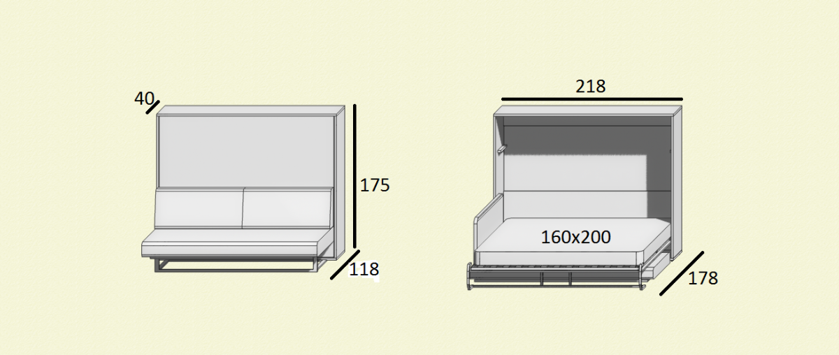 - Тщательно продуманный вид трансформации. На эскизе представлена мебель в целом и указаны габаритные размеры.