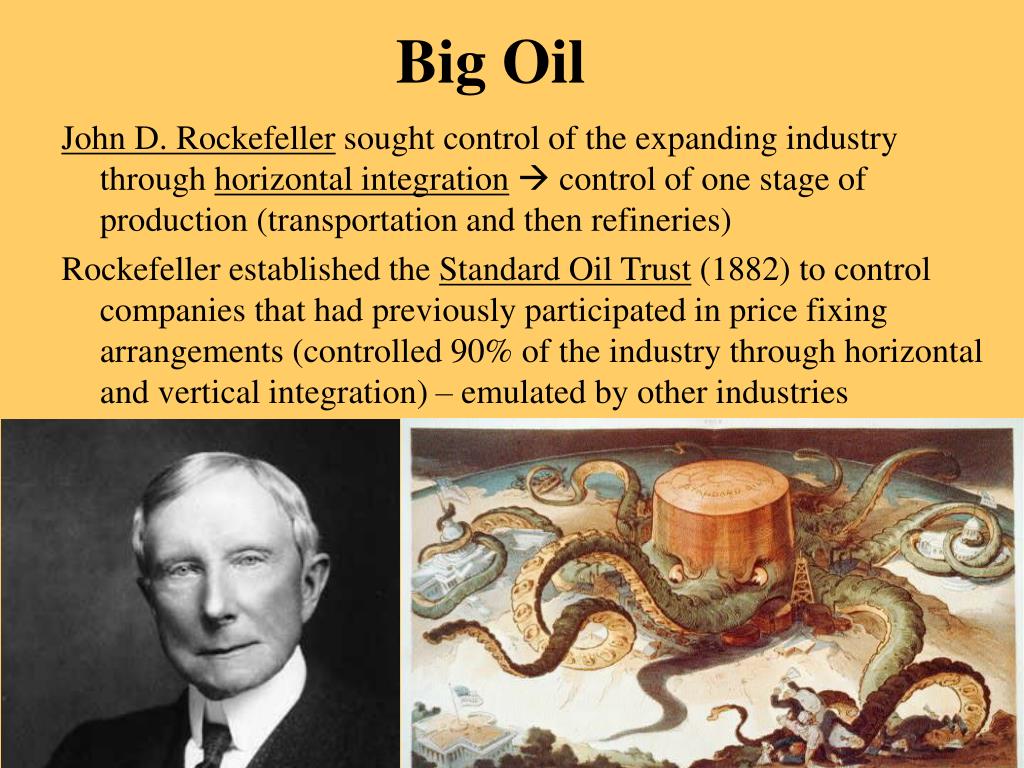 В 1870 году Флаглер убедил Рокфеллера преобразовать партнерство Рокфеллера, Эндрюса и Флаглера в корпорацию Standard Oil. Standard Oil быстро расширялась как горизонтально, скупая другие нефтеперерабатывающие компании, так и вертикально, приобретая нефтяные скважины и транспортные пути и продавая продукцию на розничном уровне. «Стандард ойл» стремилась к монопольному положению, применяя множество методов, таких как тайные скидки от железных дорог и грабительское ценообразование, которые сегодня незаконны, но не были тогда. Он также изобрел трастовую форму организации, чтобы обойти устаревшие законы о регистрации. Она платила справедливую цену за компании, которые хотела приобрести, часто расплачиваясь акциями Standard Oil и нанимая ценных руководителей. К 1880 году Standard Oil контролировала 90 процентов нефтяного бизнеса в Америке.