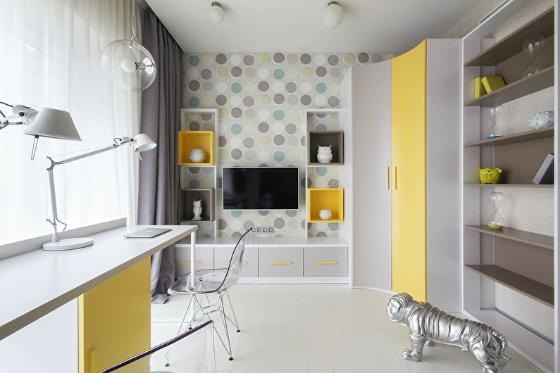 В школьном возрасте игры вытесняются на второй план и нужны уже места не для хранения игрушек, а для спортивных аксессуаров и книг. В подростковом возрасте ребенок сам может высказать своё мнение о своих пожеланиях относительно интерьера и оформления своей комнаты – рисунок покрывала, цвет штор и обоев и т.д.