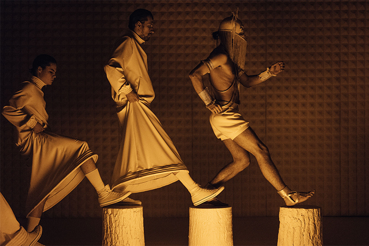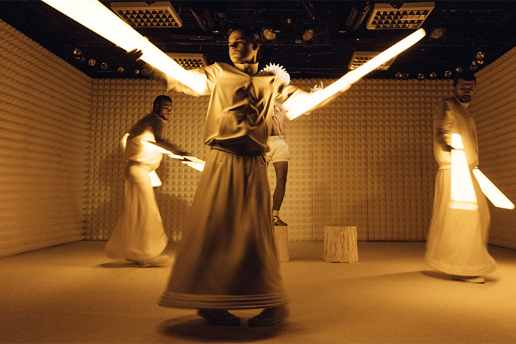 А во втором — пирамидки поролона выглядят как острые шляпки галлюциногенных грибов. Та же история и с реквизитом — персонажи почти во тьме торжественно несут три щита на коротких шестах — то ли парад с плакатами, то ли крестный ход с иконами. Когда подходят ближе, становится видно, что на каждом написана одна буква. Вместе они образуют слово «Бог».