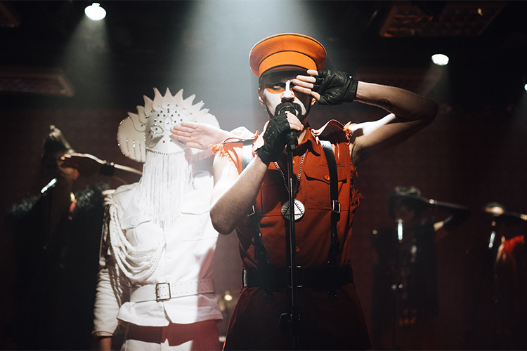 — интересен режиссеру в первую очередь как бренд, затем уже как автор литературного первоисточника, и в последнюю очередь — как создатель собственного художественного (отвлекаясь от проблемы «художественного качества») мира, потому что в чужом мире Диденко совсем не заинтересован, у него есть свой, готовый, универсальный, пригодный на все случаи жизни и творчества. А кого в этот мир помещать, загонять — Пушкина или Пелевина, Достоевского или Бабеля, Фадеева или Довженко — не так важно. К «Чапаеву и Пустоте» Диденко вместе с постоянными, проверенными соавторами прилагает готовые, годами наработанные технологии. Из текста вынимается и отбрасывается прочь скелет фабулы; все имеющиеся в произведении рифмованные, ритмизованные или просто сколько-нибудь пригодные для того, чтоб положить их на музыку и пропеть или подать через мелодекламацию куски используются как своего рода вставные номера», разбавленные ансамблевыми пластическими экзерсисами; исполнители в экстравагантных костюмах и густом гриме, фактически с «нарисованными» лицами, представляют не конкретных персонажей, но как бы образ спектакля в целом, не расчлененный на индивидуализированные фигуры; и все это происходит в сопровождении бесконечно-однообразной электронной долбежки от композитора Ивана Кушнира. Есть, правда, у «Чапаева и Пустоты» особенность, отличающая ее от предыдущих опусов Диденко и К, но роднящая, пожалуй, с «Молодой гвардией»: обязательные ингредиенты супового набора тут подаются не вперемежку, как обычно (считая и буквально «особняком» стоящего «Черного русского», который формально — «иммерсивный театр», а по факту — гламурный аттракцион), не чередуя вокал, танец и драматические сценки, монологические и диалоги (как в той же «Конармии» или в «Хармс. Мыр», идеально, по-настоящему органично — в «Идиоте»), но сепаратно, разнесенные по трем частям представления, отбитым друг от друга техническими антрактами. Кому как, но для меня такой прием превратил вечер в пытку, и я даже не могу сказать, какой из трех актов показался мне мучительнее остальных — на каждом следующем я страдал все сильнее.