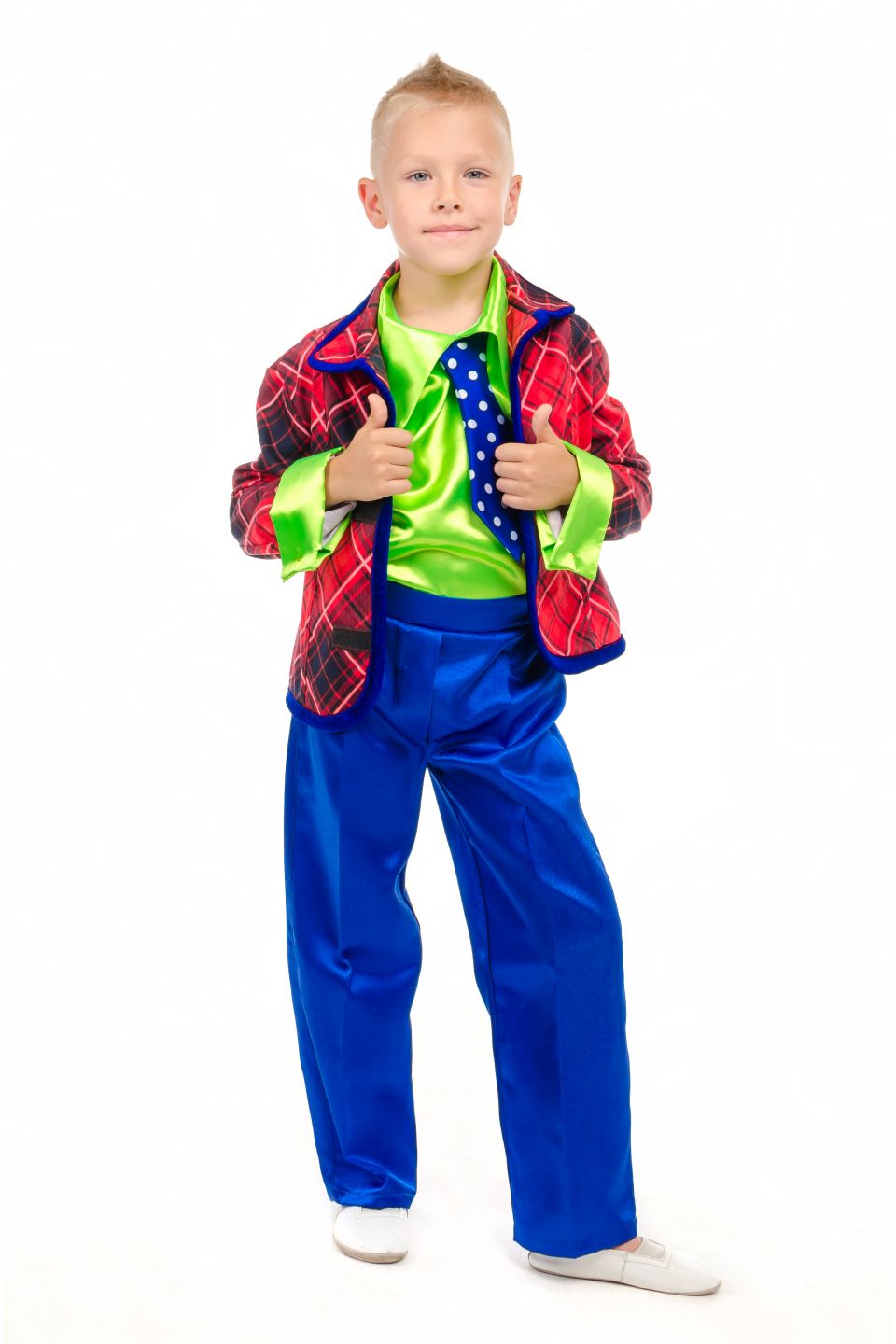 - Основа образа стиляги – пиджак. В его крое не должно присутствовать даже малейшего напоминания классики. В идеале нужно выбирать яркий однотонный вариант или же с клетчатым принтом. По фасону «стиляжный» пиджак должен напоминать куртку, но при этом обязан сидеть на ребенке свободно, лишь слегка подчеркивая фигуру.