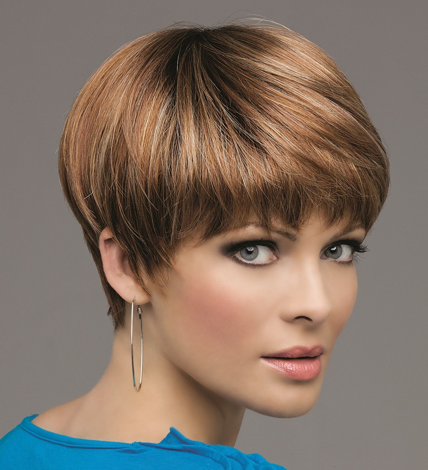 Рваная, легкая челка доходящая до бровей добавляет образу моложавости. Округлая форма прически выгодно корректирует форму лица.
