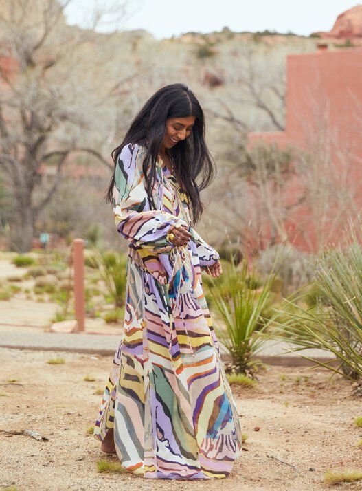 Музой и главным вдохновением коллекции стала жительница большого города, которая черпает силу и магическую энергию в повседневном городском пейзаже. Среди ключевых вещей – шерстяное пальто с бахромой на рукавах, песочные джинсы с широкими отворотами, ярко-желтый свитер-водолазка, двухцветные сапоги и легкие платья из переработанного полиэстера. Изящная цветовая палитра осенних коричневых и темно-зеленых оттенков дополняется яркими вставками томатно-красного и кислотно-желтого, наряду с причудливыми принтами, вдохновленными магнитными полями Земли.