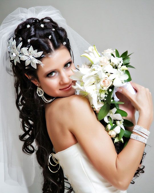 При выборе прически, ориентируйтесь на вес фаты и на способ ее крепления. Под длинную фату одинаково хорошо подходят как гладкие, так и объемные прически.