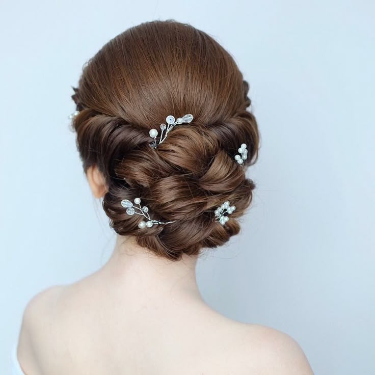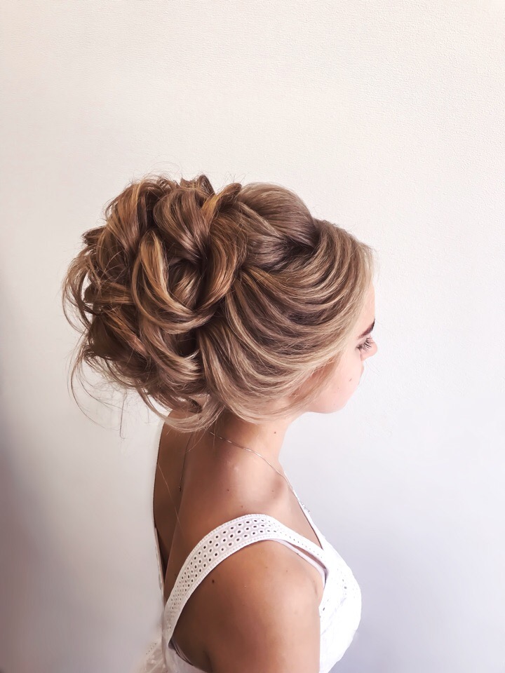 Прежде чем забирать волосы, определитесь с пробором и высотой пучка. Такой вариант хорошо смотрится на любом уровне. Главное, научиться выкладывать из локонов красивые фигуры и прочно фиксировать волосы. В качестве украшений используйте ободки, тиары, гребни, заколки с красивым плетением и кристаллами.