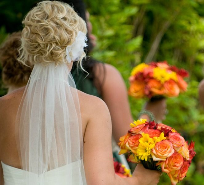 Для этой прически с живыми цветами подойдет фата-бандана, фата на гребне, которую крепят под прическу или тонкая однослойная фата «мантилья».