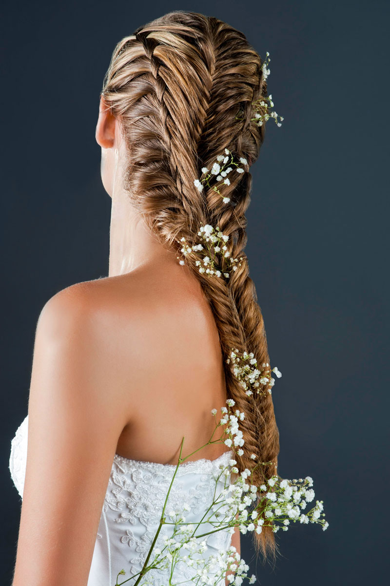 Чтобы грамотно подобрать в индивидуальном порядке то или иное плетение, остановитесь вначале на концепции мероприятия, а потом на характеристиках волос, их цвете и желаемом результате. Стильные косы на свадьбу подойдут для однотонных прядей без «лесенок». «Рыбий хвост», «улитка», «французский водопад», «дракон» или жгуты являются классикой жанра.
