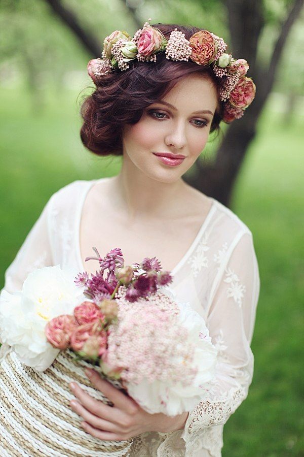 Венок из живых цветов подойдет как для собранных в изящную прическу волос, так и для распущенных и красиво завитых волос.