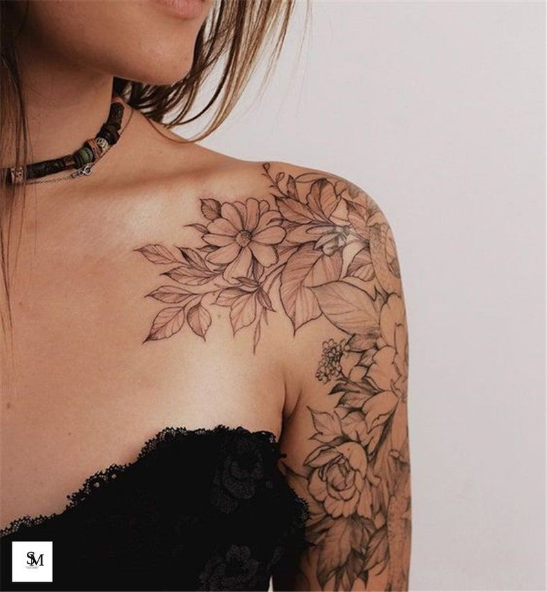 Любите цветочные татуировки? Тогда вам нужно увидеть эту следующую идею! Дизайн украшен потрясающими цветами, которые покрывают плечевой сустав и переходят на руку.