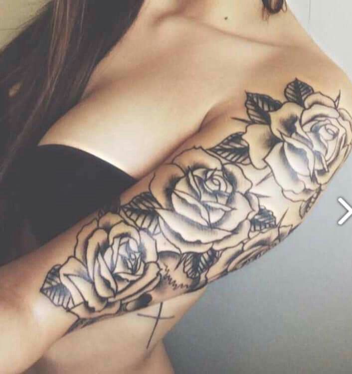 Любите розы? Тогда этот дизайн татуировки для вас! Здесь у нас есть потрясающая наплечная деталь с тремя красивыми розами. Розы также окружены великолепным лиственным узором. Вы можете выбрать многоцветный дизайн, подобный этому, или выбрать розовые цвета, которые вам нравятся или которые представляют вас. Может быть, посмотрите на язык цветов, чтобы увидеть, какие значения цвета вы должны выбрать.