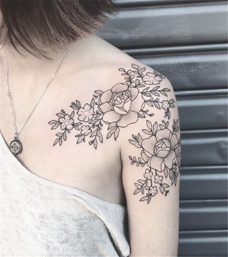 Далее у нас красивая цветочная татуировка. Эта татуировка украшена цветами на плече, а рисунок продолжается на ключице. Поскольку татуировка на ключице и плече, она действительно выделяется и делает заявление. Вы можете попробовать такие цветы пиона или выбрать другие цветы для своей татуировки. Вы также можете украсить цветы, добавив ярких красок.