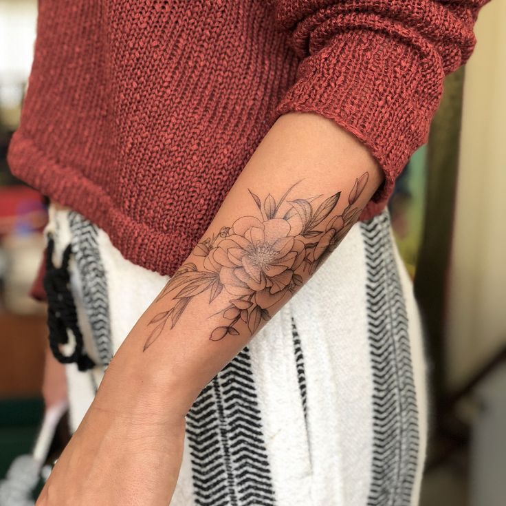 Эта часть предплечья также является местом, которое не сильно повредит и может распространяться на плечо и запястье.Цветочная татуировка предплечья