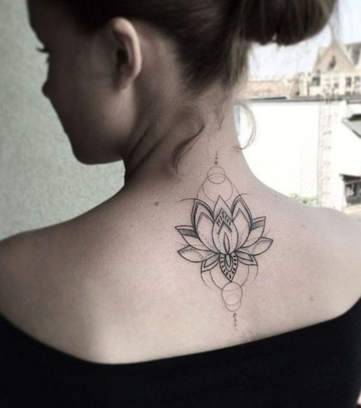 - На спине красиво выглядят симметричные рисунки, например, схематичный лотос в верхней части позвоночника.