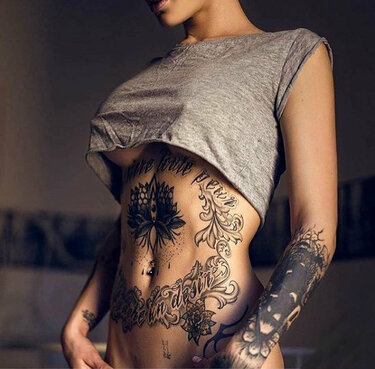 - Живот. Многие девушки выбирают для нанесения наколок живот или зоны на талии. Масштабные изображения модницы здесь обычно не накалывают, а вот миниатюрные решаются набить гораздо чаще. Распространенные варианты для рассматриваемого участка тела – флористические тату, летающие бабочки или мелкие муравьишки, прикольные рисунки в направлении нео традишнл.