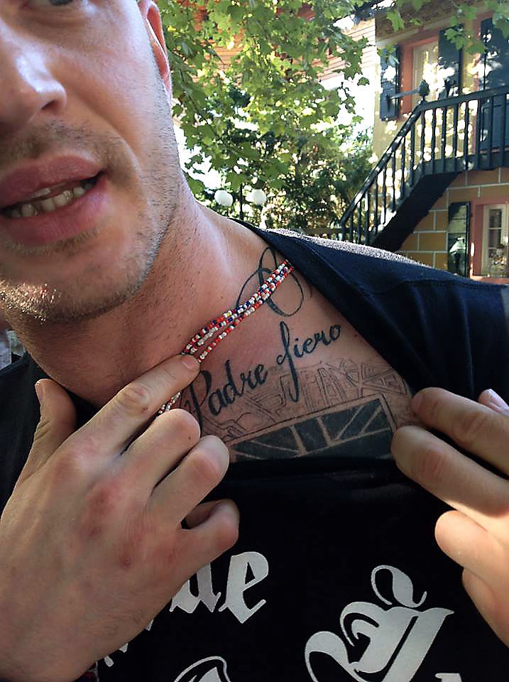 Татуировка «Padre fiero»Татуировка: На ключице слева над сердцем написано «Padre Fiero».