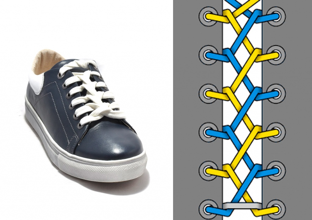 Шнурок меньше трется, потому что он не трется об ушко. Вместо последовательного шаблона пересечения есть два уровня крестов. Это выглядит так же хорошо на кроссовках, как и на ботинках.