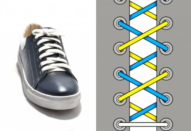 Очень декоративная шнуровка, особенно для высоких ботинок или сапог с использованием шнурков контрастного цвета. Внимательно следуйте схеме, чтобы не запутаться (начинаете с серого отрезка-середины шнурка, затем один конец показан голубым, другой — жёлтым).