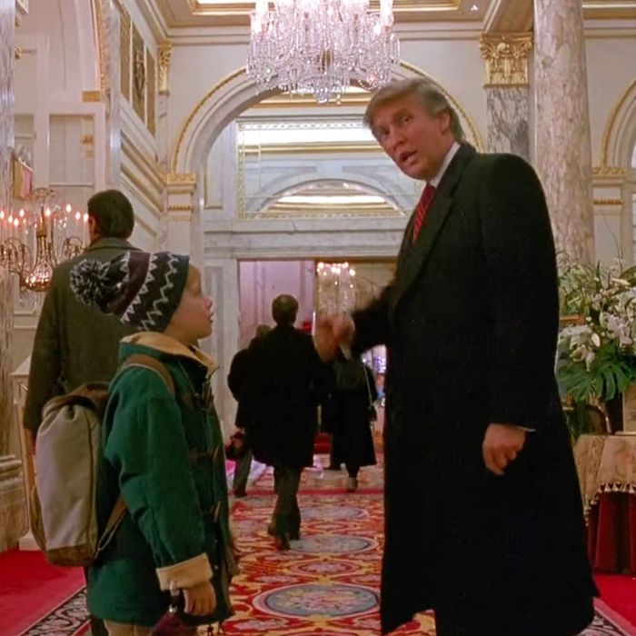 Калкин сыграл Кевина Макаллистера, который разлучается со своей семьей и оказывается в Нью-Йорке. В какой-то момент Кевин пересекается с Трампом в отеле «Плаза». Он спрашивает Трампа, как пройти к вестибюлю отеля, и Трамп в ответ небрежно указывает ему правильное направление.