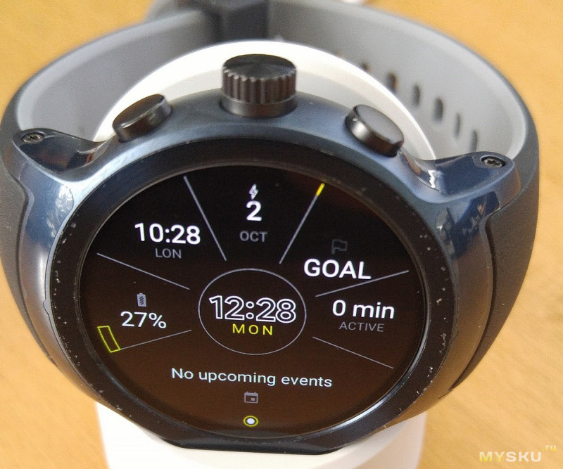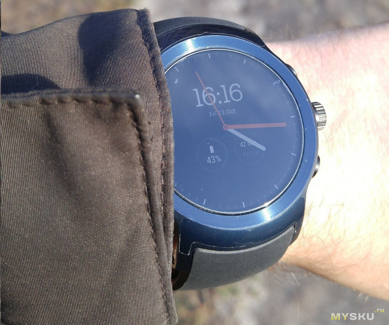 Часы оказались не такими тяжелыми, я носил LG G watch массой 63 грамма, а у этих масса 89 грамм — мне не принципиально. Да и их толщина совсем не ощущается. Вот разве что начал цепляться часами за всё вокруг, так что транспортные плёночки пока решил не снимать. К кнопкам и управлению привык с первой минуты, как если бы всегда носил именно эти часы. А прокрутка перечня коронкой — ну просто очень удобная функция!