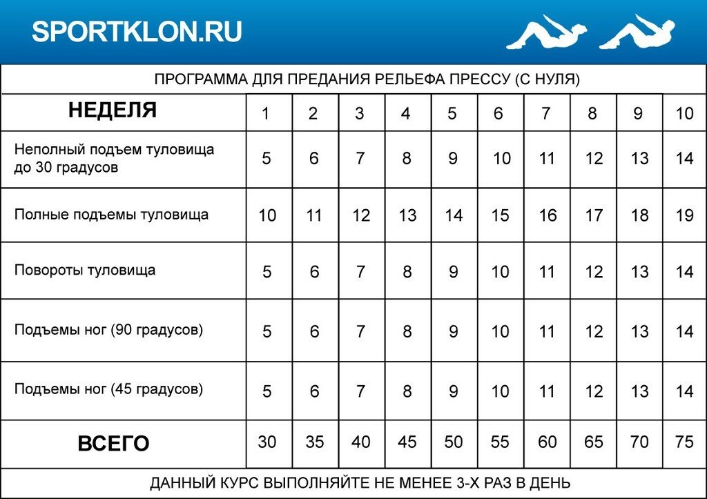Рекомендую выполнять от 4 до 6 упражнений в трех подходах, с интервалом отдыха в 30-60 секунд, так Вы извлечете максимум пользы и эффективности, проработаете все отделы брюшного пресса и с каждой тренировкой будете становиться на шаг ближе к заветной цели.