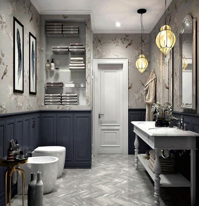 Стильный дизайн: главная ванная комната в классическом стиле с серыми стенами, разноцветным полом, обоями на стенах, фасадами с утопленной филенкой, синими фасадами, врезной раковиной, белой столешницей, тумбой под одну раковину и напольной тумбой — последний тренд