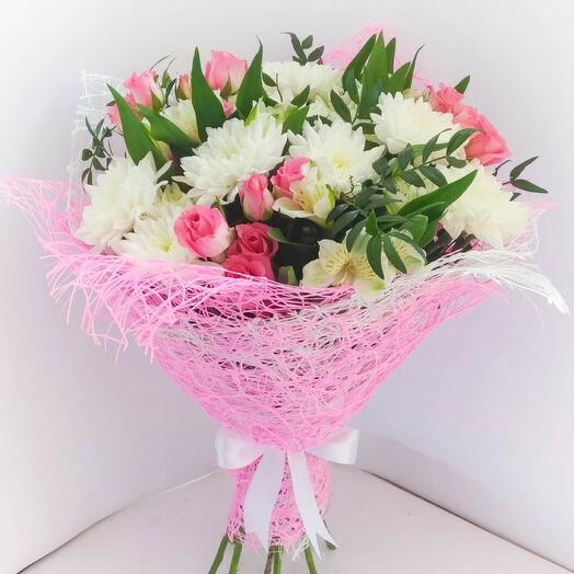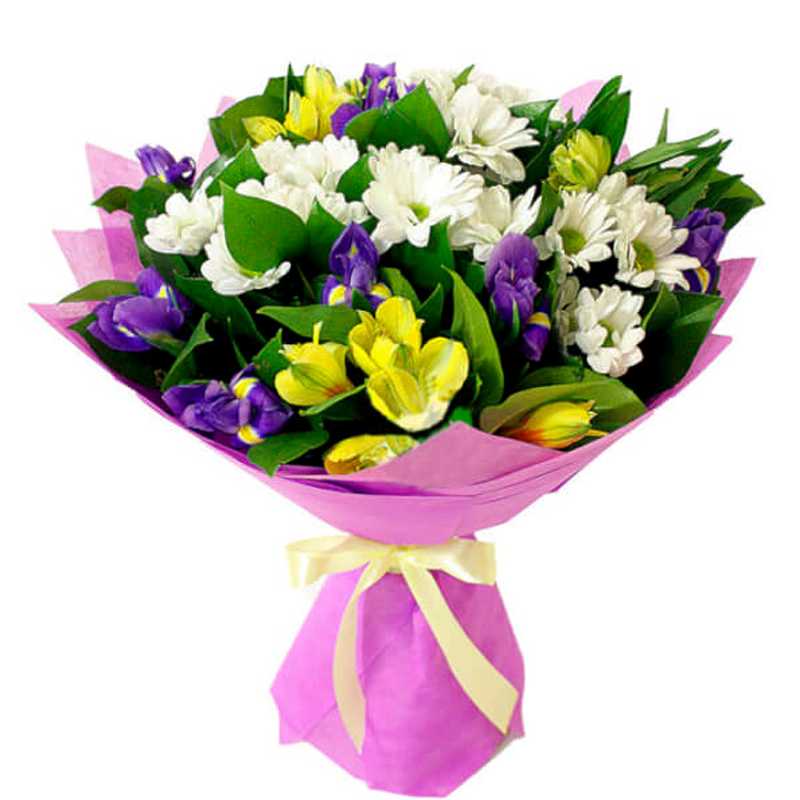 Для составления круглого букета требуется много бутонов. Подойдут астры, тюльпаны, гвоздики, ирисы, мелкие розы, полевые и садовые цветы.