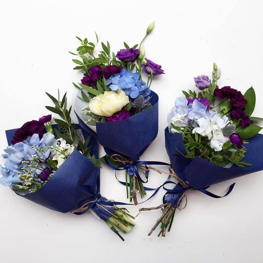 Треугольная схема сборки букета основана на правиле 3-х треугольников асимметричной формы. В основе композиции лежат 5-7 цветков разных видов. Некоторые можно заменить аспарагусом или нефролеписом.
