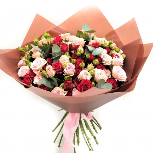 Форма симметричной цветочной композиции чаще всего круглая. В зависимости от техники сборки букета (параллельная или спиральная), стебли цветов могут быть одной или разной длины.