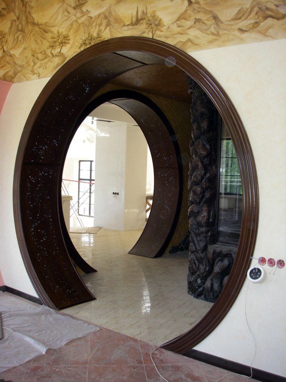 Проемы арки можно отделать деревом и украсить резьбой. Но нужно помнить, что окантовка деревом придает тяжеловесность интерьеру. Плохо сочетаются несколько видов дерева в одном помещении. Обрамление деревом требует установки межкомнатных и входной двери с внутренней отделкой из такой же древесины или шпона, и мебель в смежных с аркой помещениях оформляется из тех же пород дерева.