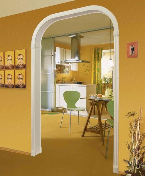 В разделительной зоне для кухни и столовой или аналогичных помещениях нередко применяют широкие трехцентровые или псевдотрехцентровые конструкции. Это сильно вытянутый и слегка закругленный (во втором случае только по углам) свод. Такая форма близка к квадратной или прямоугольной форме портала, жесткие линии которого соответствуют ультрасовременным энергичным и стремительным направлениям в дизайне.