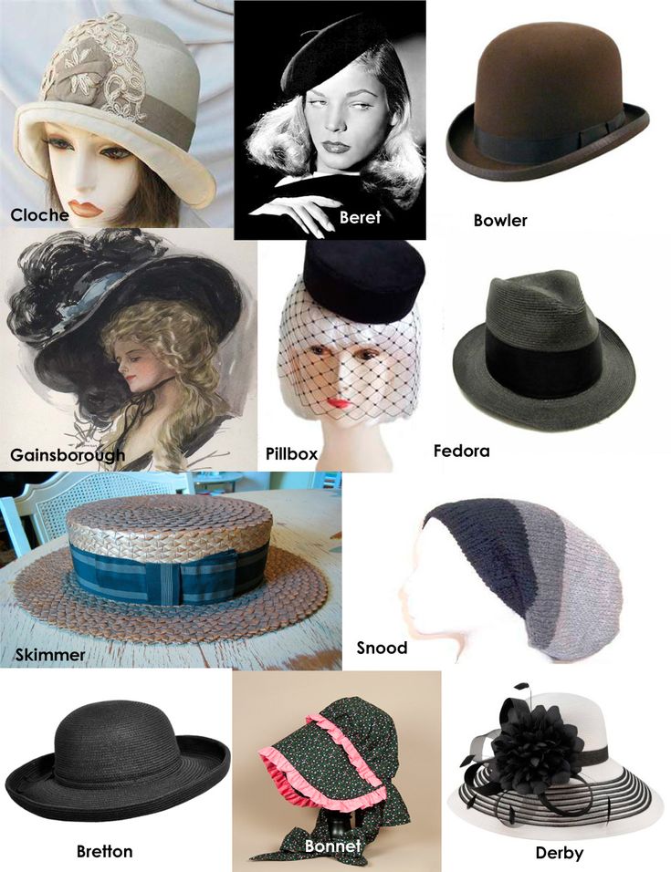 Категории Визуальный словарьТипы головных уборов — Руководство по типам мужских головных уборов — Типы женских головных уборов