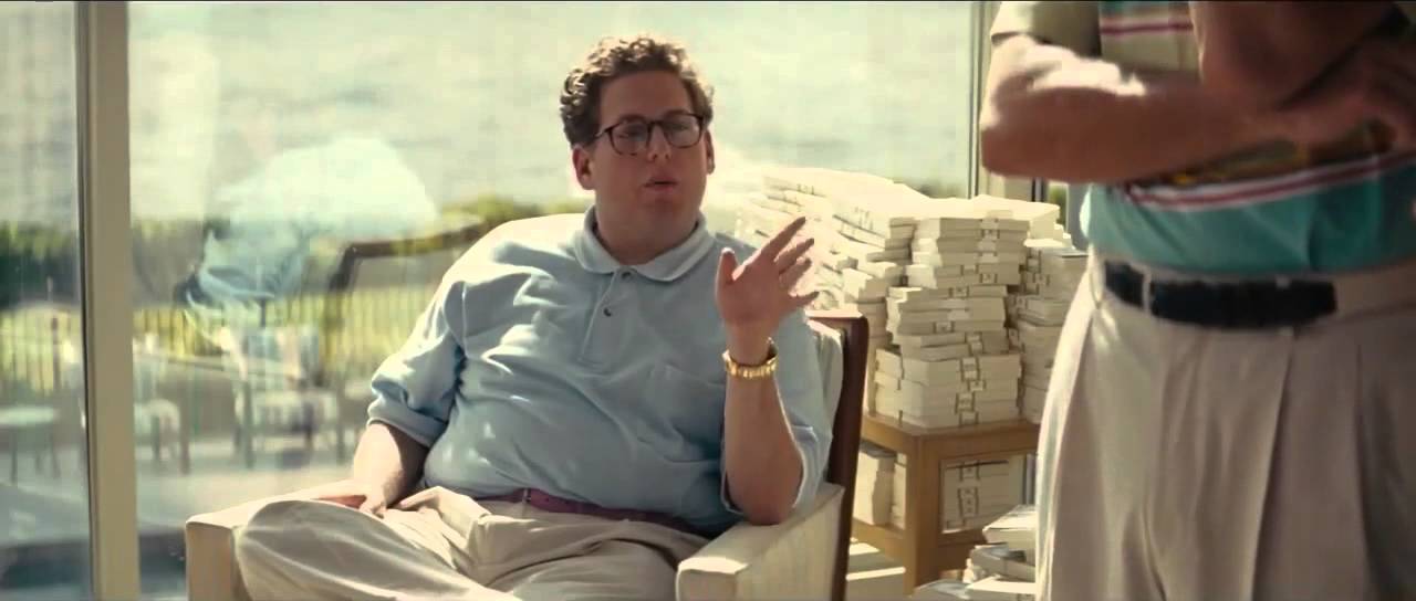 Он говорит нам, что является сыном двух бухгалтеров, живущих в Бейсайд, в Куинсе. С тех пор как он начал работать на Уолл-стрит, Джордан наслаждается жизнью в бесконечном наркотическом угаре, снимая бесчисленных проституток на любой вкус. Показывают, как он нюхает кокаин с задницы проститутки, а потом, как он летает на вертолете под воздействием куаалюда. Мы также видим его в салоне своего Феррари, получающего минет от девушки, которая, как оказывается, является его прелестной женой Наоми Лапалья (Марго Робби). Если верить словам Джордана, количества препаратов, которые он употребляет, хватит на то, чтобы усыпить большую часть населения Нью-Йорка. Но один наркотик он любит особенно сильно. Тот наркотик, который может позволить человеку завоевать мир. Деньги. Он снюхивает дорожку кокса стодолларовой банкнотой, сминает ее, а затем бросает в мусорную корзину. Фильм начинается по сути с концовки, но действие происходит по порядку.
