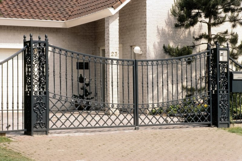 Schwarzes geschmiedetes Tor mit Ornamenten auf weißem Grund
