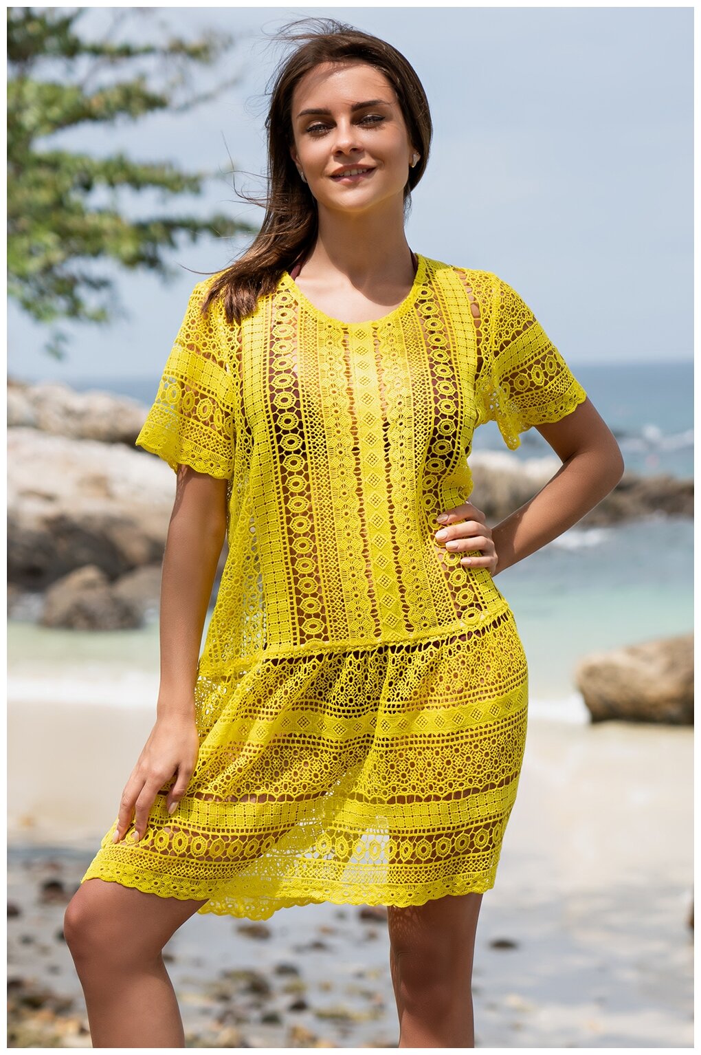 Белые, черные, красные, желтые, зеленые сетчатые туники смотрятся эффектно на фоне загорелой кожи. Обратите внимание на туники с крупными дырками, которые без стеснения покажут ваш купальник и фигуру. Сетка может быть представлена геометрическими фигурами, треугольными или четырехугольными узорами.