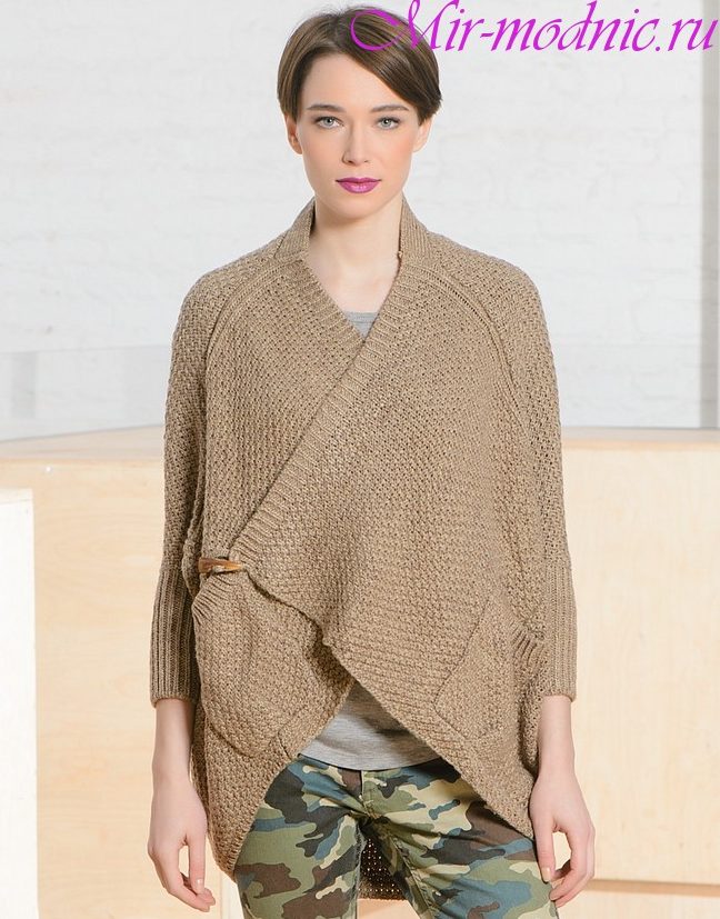 Большой популярностью пользуется и асимметричный вязаный кардиган. Такие изделия могут иметь ажурную или достаточно грубую и плотную вязку. Они всегда выглядят объемно. Потому сочетать подобные изделия следует с вещами простого кроя. Это поможет избежать громоздкой композиции, которая сделает фигуру чересчур массивной.