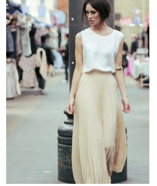 - Бежевая юбка в пол. Модель из струящейся ткани чаще всего сочетают с ярким топом или маечкой в пастельной гамме, блузкой приталенного кроя из полупрозрачной ткани;