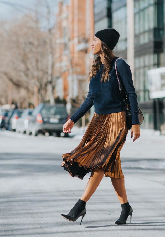Юбки миди со складками — одни из самых удобных и универсальных юбок. Для идеально отполированного и скоординированного наряда нам нравится монохромный образ, похожий на наряд выше. Чтобы создать более эклектичный стиль, мы также любим экспериментировать с плиссированными юбками-миди с причудливыми узорами и сочетать их с контрастными текстурами.