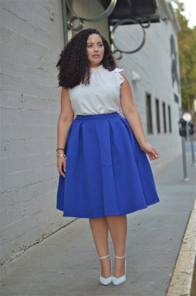 С широкого фасона синей юбкой, а также с юбкой-трапецией или юбкой в складку можно создать офисный стиль, надев к ней черную, красную, бежевую или желтую блузу или рубашку, а также эти предметы из ткани с цветочным или геометрическим принтом.