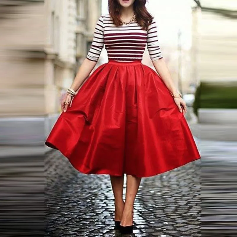 Женщины с красивыми пропорциями тела и приятной округлостью отдают предпочтение моделям с широкой юбкой длиной чуть ниже колена и до середины икры.