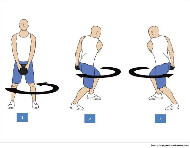 2. Начните вращать гирю вокруг себя, перехватывая руками гирю за спиной и перед собой. Сохраняйте стабильное положение корпуса, не раскручиваясь из стороны в сторону.