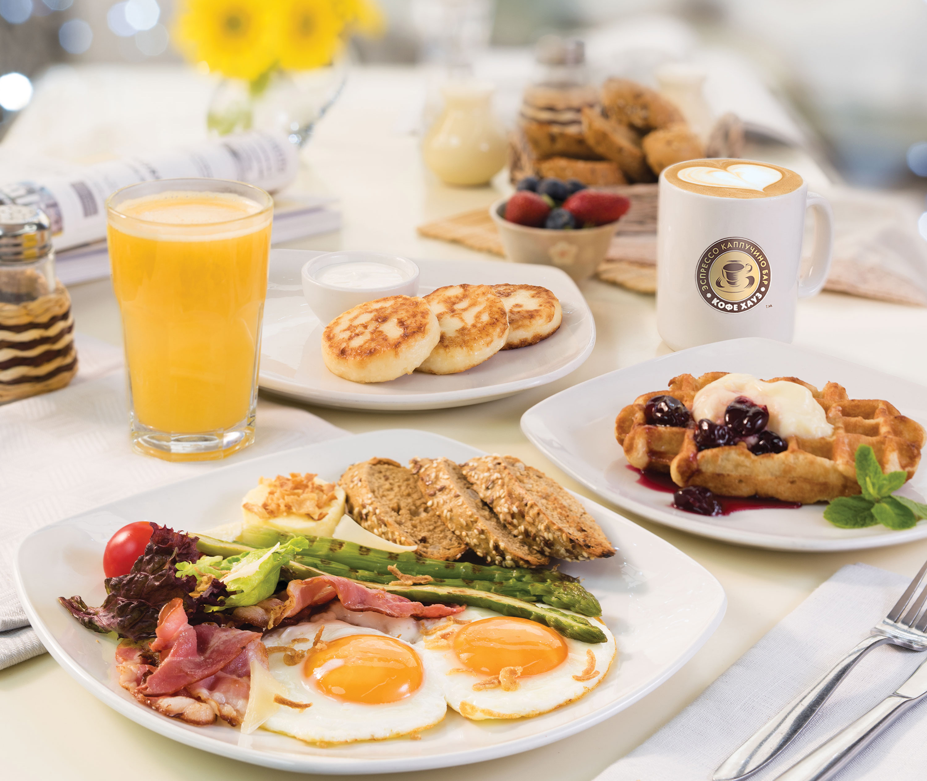 Завтраки здесь соответствующие: вместо блинчиков предлагают пышные панкейки, а порции яичницы или омлета — щедрые и с сытными топингами.