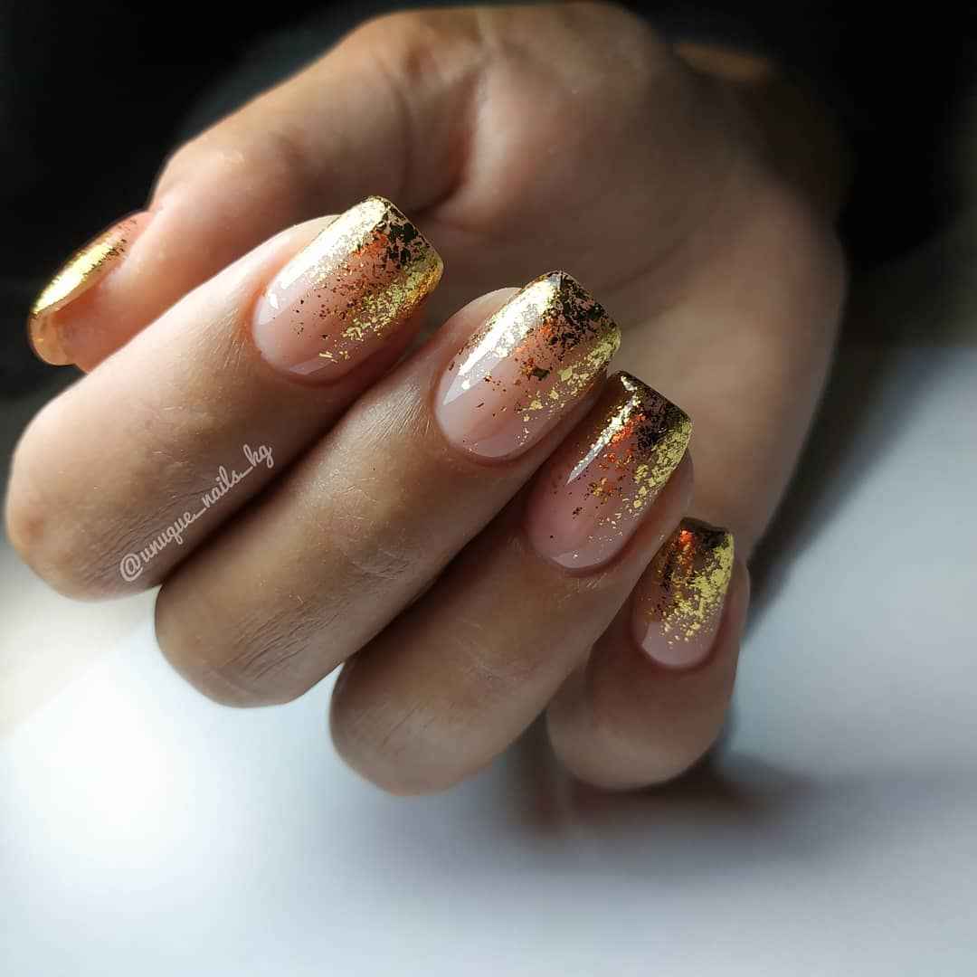 Нам нравится, как нейтральный персиковый цвет на верхней половине этих ногтей контрастирует с ярким и сверкающим золотом на кутикуле. Это лучшее из обоих миров!
