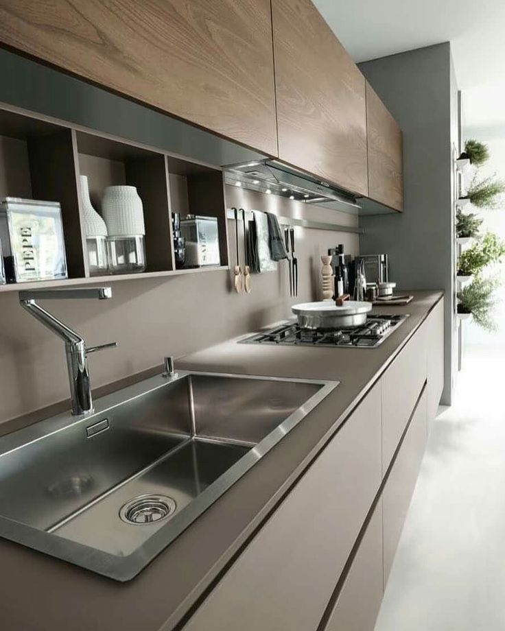 Нержавеющая сталь, алюминий и другие современные металлы часто используются в современной кухонной утвари и технике. В рамках общей простой эстетики современной кухни приборы часто хранятся в нишах, где к ним легко получить доступ, но при этом они не загромождают столешницы.