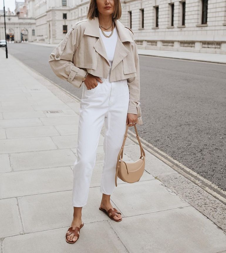 Если вы не хотите идти до конца и носить все белое, попробуйте такой наряд. Белые джинсы в сочетании с нейтральными.