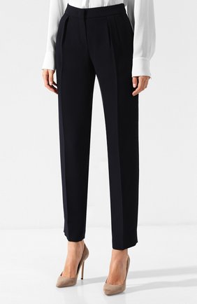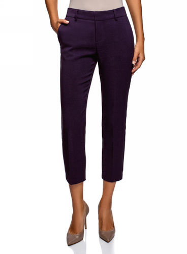 Укороченные, суженные книзу темно-синие брюки подчеркивают талию и вместе с пиджаком такого же или чуть темнее цвета составляет деловой образ.