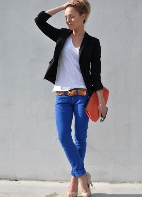 Синие джинсы подходят буквально к любому виду одежды, поэтому подобрать верх не составляет особого труда. Трудность бывает в том, чтобы создать оригинальный образ и выделится на фоне других.