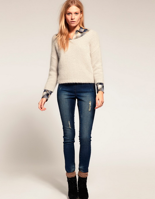 Такой фасон также подходит обладательницам фигуры типа«треугольник» и позволяет уравновесить объемный верх. - Джеггинсы. Джинсовые леггинсы идут всем, кто привык носить скинни. Пожалуй,они чуть более удобные. Дополнить их можно жакетом до середины бедра или удлиненным джемпером.