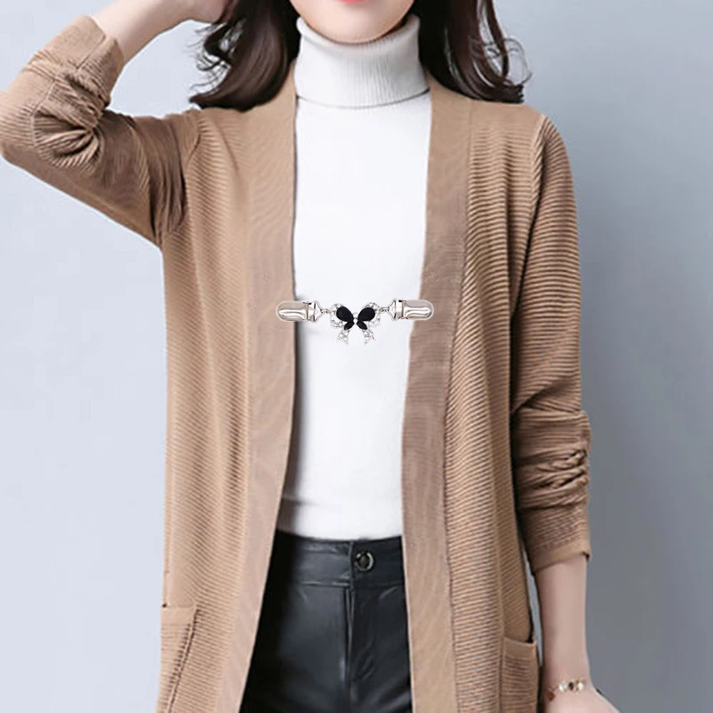 - зажимом для кардигана – этот декоративный элемент фиксируется на краях полочек или на воротнике. Между зажимами находится декоративная цепочка или нить с бусинами.